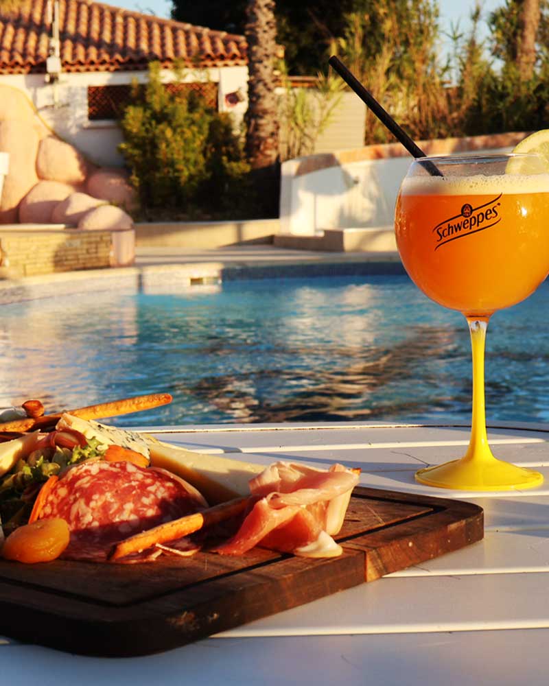 Juste à côté, le bar-restaurant prolonge les plaisirs de la piscine. On y commande une boisson fraîche, une glace ou un café, sans quitter l’ambiance estivale du bassin. Un espace où l’on se retrouve naturellement, pour un goûter, un apéritif ou un simple moment de détente au bord de l’eau.
