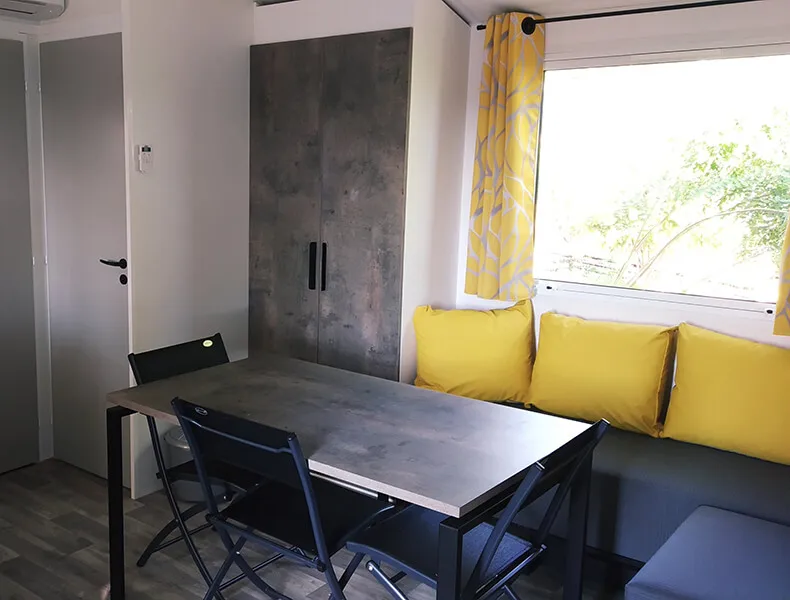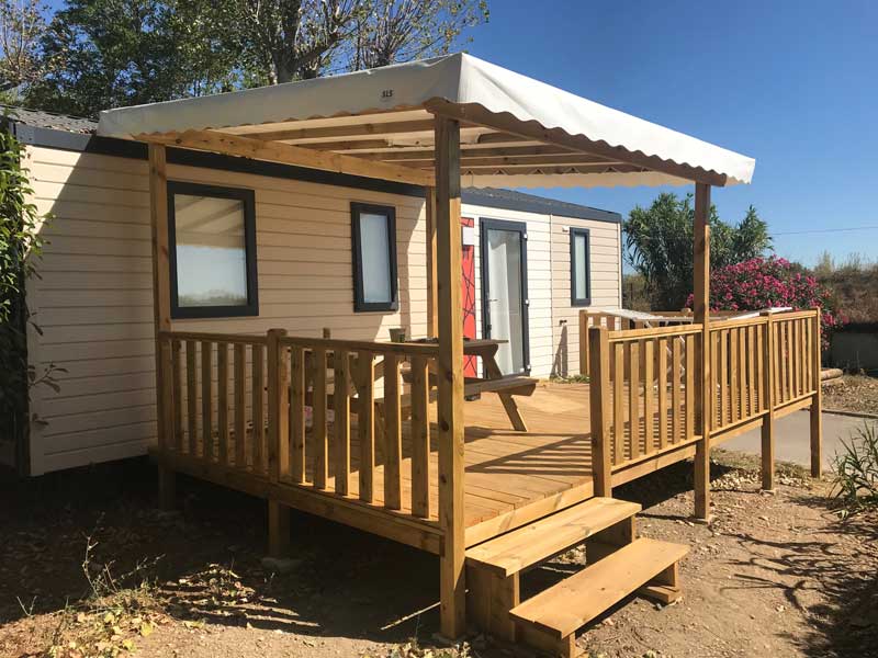 La terrasse du Mobil-home Capelado est un véritable espace de vie supplémentaire. Aménagée avec une table forestière, elle permet de profiter de repas en plein air, de moments de détente ou de soirées conviviales sous le ciel méditerranéen.