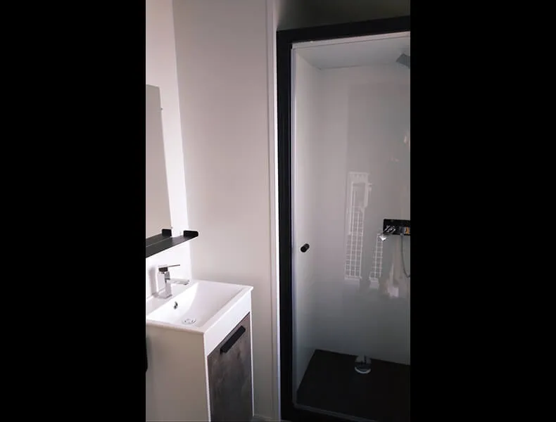 Spacieux et fonctionnel, ce mobil-home dispose d’un salon central accueillant avec table, chaises et canapé convertible, parfait pour les moments de détente. La cuisine ouverte, équipée de tout le nécessaire, facilite les repas en famille. Côté nuit, une chambre parentale avec lit double et deux chambres enfants avec lits simples garantissent à chacun son espace de repos. La salle d’eau avec douche et lavabo, ainsi que les WC séparés, complètent cet agencement harmonieux.