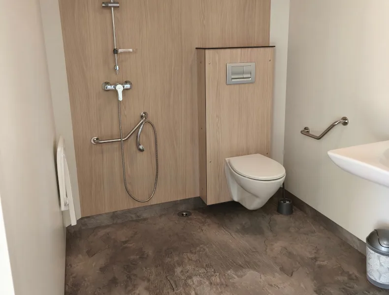 Ce mobil-home allie confort et praticité, avec un salon central spacieux comprenant table, chaises et banquette convertible deux places. Les deux chambres, l’une avec lit double et l’autre avec deux lits simples, offrent un aménagement aéré et accessible. La salle d’eau adaptée est équipée d’une douche XXL et de barres de maintien, facilitant les déplacements. L’ensemble de la structure a été pensé pour permettre une circulation fluide, sans marches ni obstacles.
